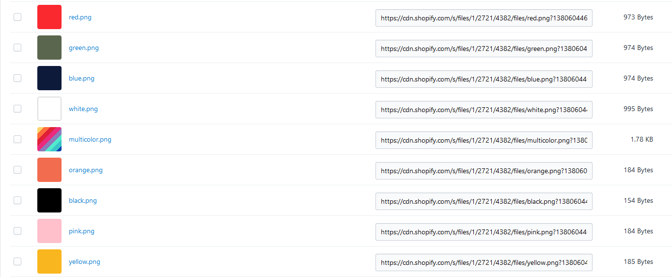 Note: There's an important naming convention to respect here! The image must be named after the color option, but be handleized, and have a .png extension. You should upload image size 50x50 pixels.