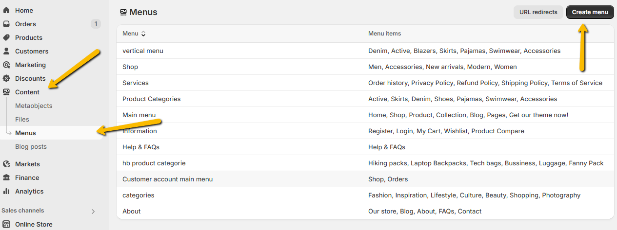 For the most part, you’ll set up and manage your store’s main menu from the Shopify admin ( Online Store > Navigation )