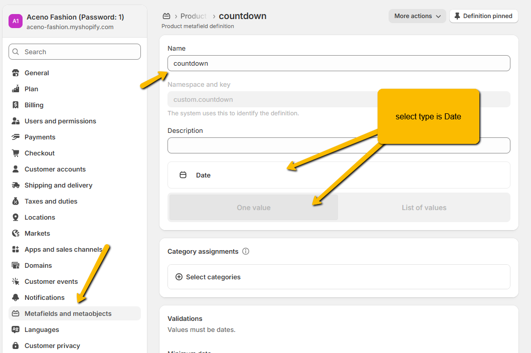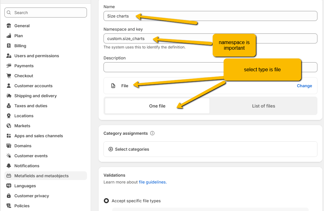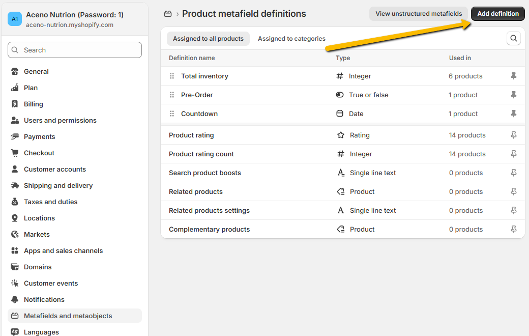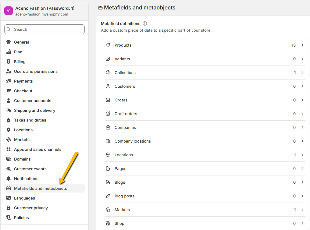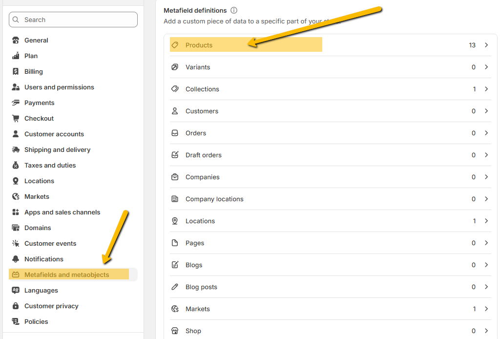 From your Shopify admin, go to settings > Metafields and metaobjects.