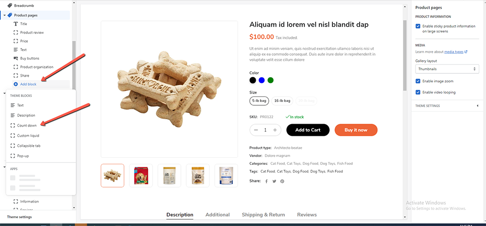3. Go to Product page > Product information > add block > Count down