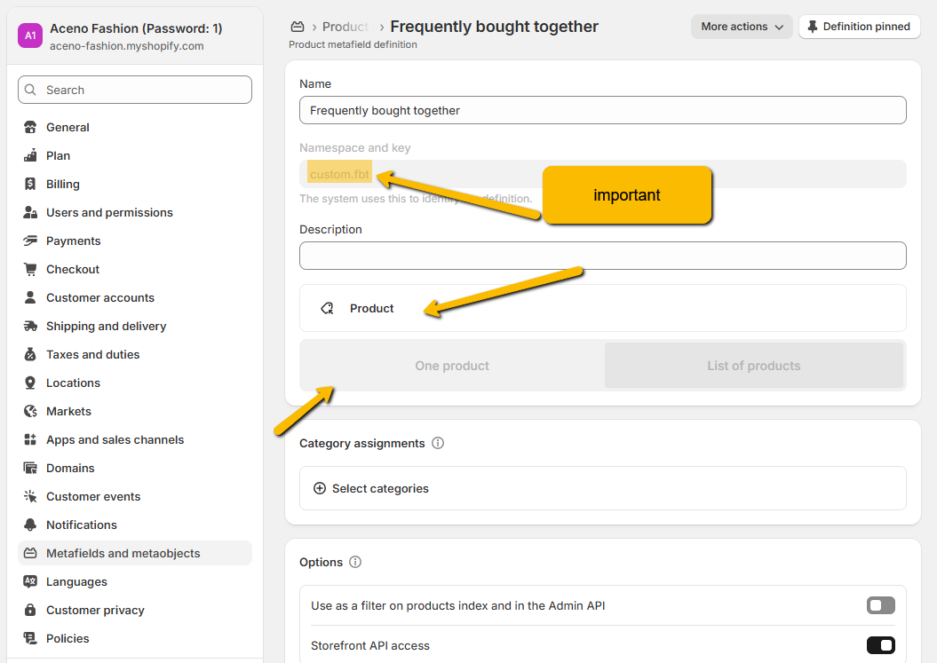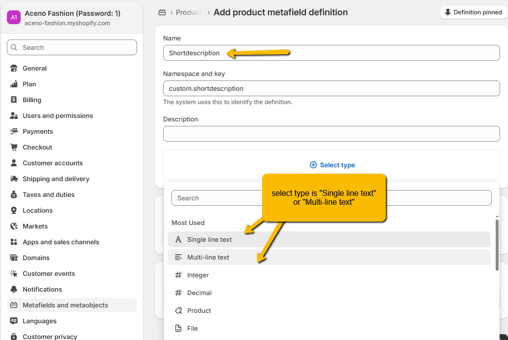 From your Shopify admin, go to settings > Metafields and metaobjects > Products > Add definition