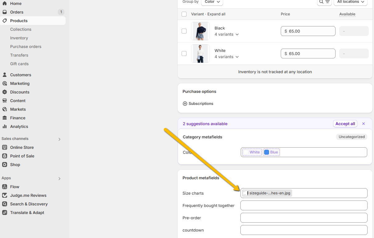 From your Shopify admin, go to products > select product > Size charts and Choose uplodate size chart