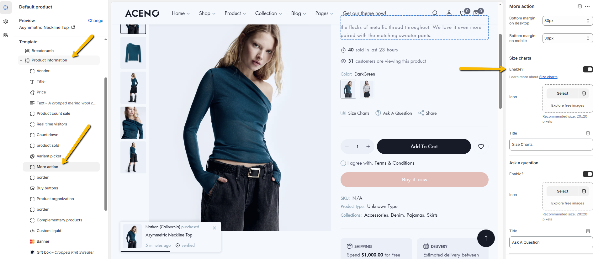 3. Go to Product page > Product information > More action > Enable "Size charts"