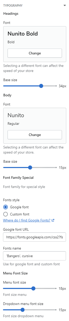 Our themes comes with a config of hand-picked fonts for your store. You can use google fonts or your custom fonts. Font size can be set for your store by using range slider.