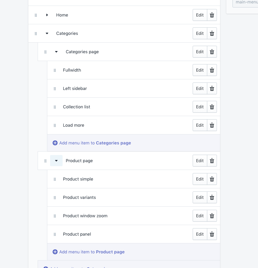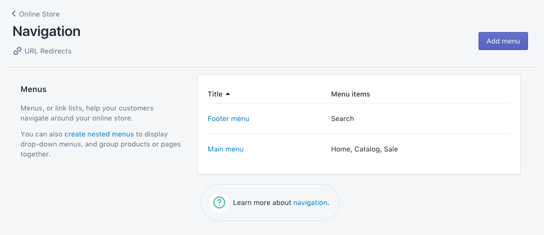 For the most part, you’ll set up and manage your store’s main menu from the Shopify admin ( Online Store > Navigation )